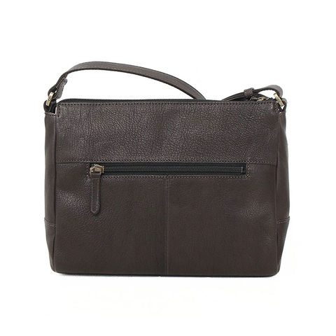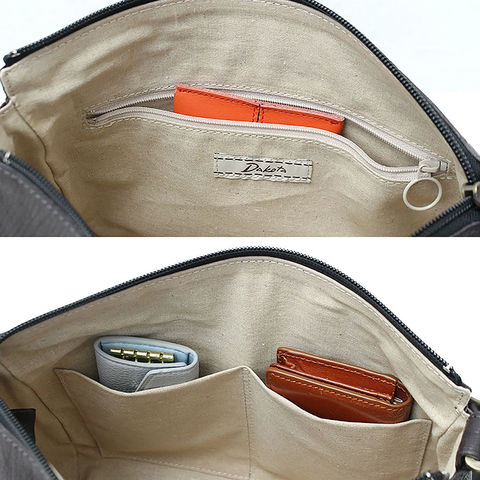 背面にはファスナーポケットを一つ備え、すぐに取り出したい小物の収納に便利です。内装にはファスナーポケット一つとオープンポケット二つを配置し、バッグの中をすっきり整理できます。