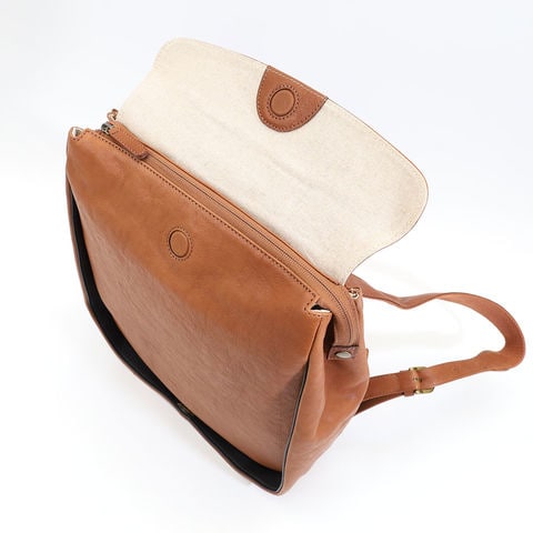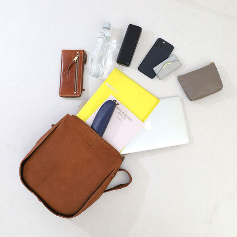 荷物が底にたまって取り出しにくくならないよう、上部から吊り下げたポケットを配置。中身を整理しやすく、必要な物をすぐに見つけられます。両サイドが開いているので、折り畳み傘や長財布など長めのアイテムも収納しやすく、日常使いに便利です。