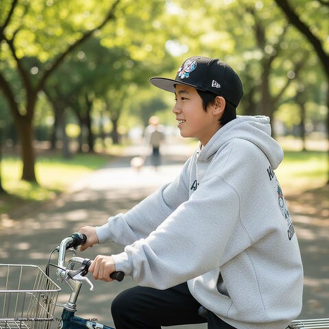 アジャスタブル仕様のスナップバックを採用し、頭回り約52cmから55.8cmまで調整可能。成長の早いキッズ世代でもサイズに悩みにくく、買い替えの頻度を抑えながら長く使えるのが魅力です。フィット感も安定し、被り心地の良さが続きます。
