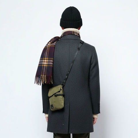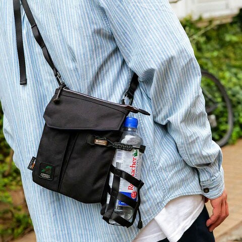 背面にメッシュドリンクホルダーを備え外出先で購入した飲み物をスマートに持ち運べます。付属コードで上部を固定すれば揺れを抑えて安全に携帯でき使用しない時は本体にすっきり収納可能です。サコッシュ本来の軽快さも損ないません。