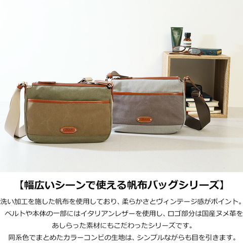 外装:ファスナーポケット×1、オープンポケット×2 内装:ファスナーポケット×1、オープンポケット×2 ・ショルダーベルト着脱不可 カラーコンビの帆布生地を使ったミニショルダーです。 ベルトや本体の一部にはイタリアンレザーを使用し、カジュアルながらどこか品のある雰囲気に。 コンパクトなサイズ感ですが、マチがしっかり設けられており、長財布やペットボトルを楽に収納できます。 内外ともにポケットの多いデザインは、お出かけや旅行の際にも大活躍してくれそうです。 ※こちらの製品は天然皮革を使用しており、革そのものの風合いを生かすため、過度な色止め加工などは行っておりません。そのため、水に濡れたり、強い摩擦などにより、色落ちする恐れがございます。薄い色のお洋服などにお持ちいただく場合には、ご注意くださいますようお願い申し上げます。 ※また、お使いいただく中で日に当たることにより、色が褪せてきたり、逆に濃くなってゆくことがございます。これは、天然皮革特有の経年変化になりますので、予めご了承ください。 ※なお、天然皮革がもともと持っているキズやシワ、染め上げる際に生じる色ムラなどもございます。天然の素材である証でもありますので、一つ一つ違う革本来の風合いをお楽しみいただければ幸いです。 |