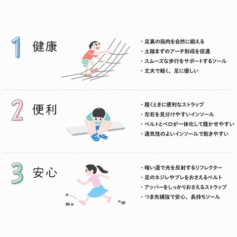 土踏まずのアーチ形成を促す機能、歩行のサポート力、快適性、安全性、着脱のしやすさ、お手入れのしやすさ など、イフミーには子どもたちの足と大人にうれしい機能がいっぱいです!