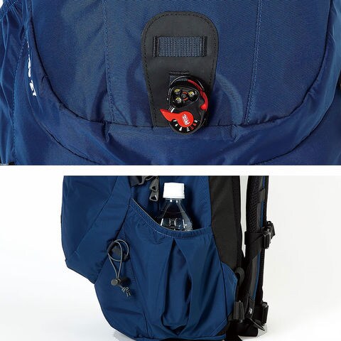 トレッキングポールを固定できるポールキャリアやライトや熊鈴を装着できるループを装備。両サイドのストレッチポケットはボトル収納にも対応し、必要な装備をすぐ使える位置に携行できます。自然環境でも日常でも使いやすい実用的な設計です。