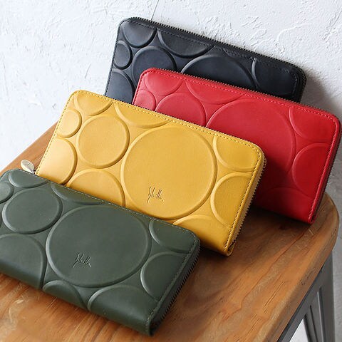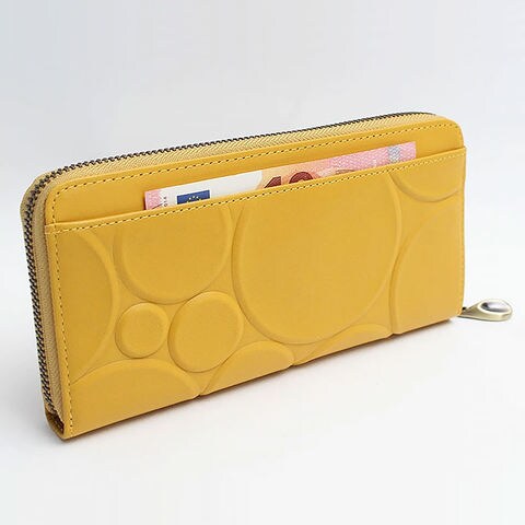 牛革に大小さまざまな円を大胆に型押しした、表情豊かなドットデザイン。ぷっくりとした凹凸が手に心地よく、視覚と触覚の両方で楽しめます。毎日使うほどに愛着が増す、存在感のある仕上がりです。