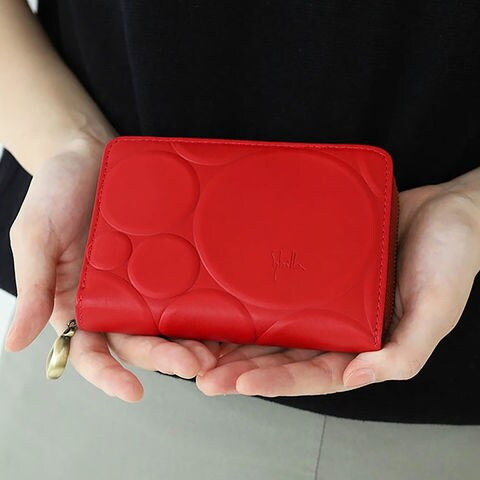 大小さまざまな円を大胆に型押しした、表情豊かな凹凸デザイン。なめらかなスムースレザーに立体感を与え、見た目の楽しさだけでなく、指先に伝わるやさしい触感も魅力です。毎日使うほど愛着が深まります。