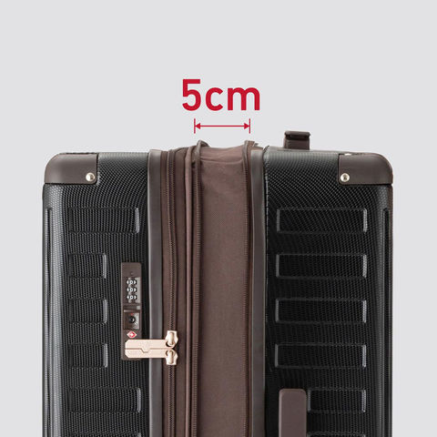 ファスナー操作でマチ幅が約5cm広がり、容量は64Lから75Lへアップ。旅行先で荷物が増えても余裕を持って収納できます。お土産や衣類などもまとめて入るため、連泊旅行や出張でも安心して使える設計です。
