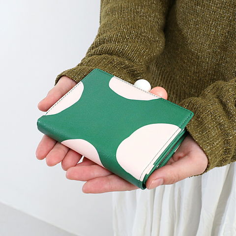 大きな手描きドットがランダムに配された「ズームドット」シリーズのがま口二つ折り財布。