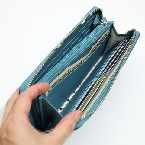ラウンドファスナー仕様で大きく開き、中身が見やすい構造。カードや小銭、お札をすっきり収納でき、スマートな使い心地を実現しています。