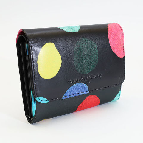 手描きのように滲んだカラフルドットが目を引くデザインで、持つたびに気分が明るくなる華やかさが魅力です。一点ずつ柄の表情が異なるため、自分だけの特別感を楽しめます。バッグの中でも存在感があり、毎日の相棒として愛着がわく一品です。