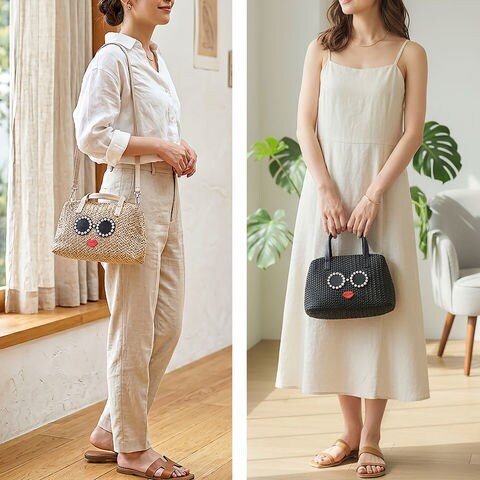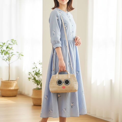 ポリプロピレンとポリエチレン素材を使用したかご風デザインで、軽やかな持ち心地を実現。ナチュラルな雰囲気を楽しみながら、日常使いしやすい扱いやすさも魅力です。季節感のある素材感がコーディネートに涼しげな印象をプラスします。
