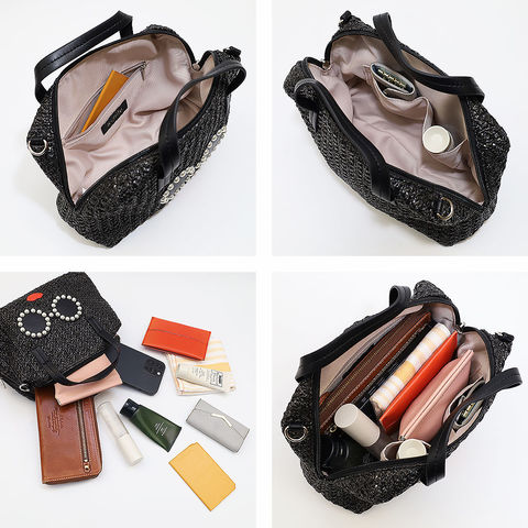 内側にはファスナーポケットとオープンポケットを備え、小物を整理しながら収納できます。財布やスマートフォン、ポーチなどの必需品もすっきり収まり、さらに500mlペットボトルも収納可能。日常のお出かけに便利なサイズ感が魅力です。