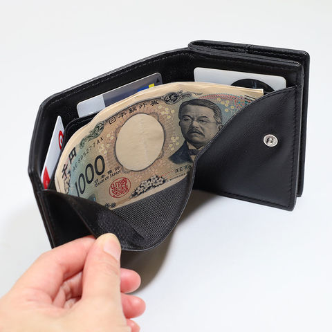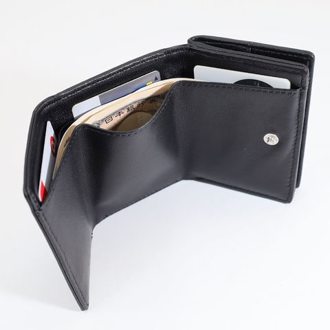 三つ折りを開くと、お札スペースとカードポケットが3つ。さらに背面にもカードポケット付き。見た目はコンパクトなのに、小銭・お札・カードがきちんと入る、実力派のミニ財布です。