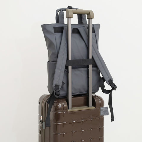 背面にはスーツケースのハンドルに差し込めるキャリーオンベルト付き。出張や旅行など、移動が多いシーンでもスマートに持ち運べます。