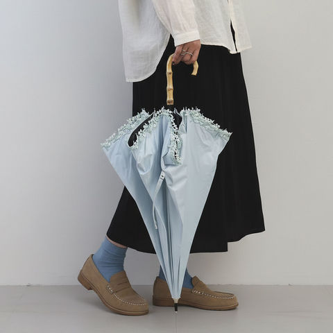 直径82cmで身体やバッグを覆いながら扱いやすいサイズ。約340gの重量で安定感があり、8本骨構造でしっかり使用できます。バンブーハンドルの自然な風合いが手元に上品さを添え、日常使いに適したバランスを備えています。