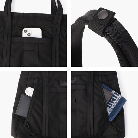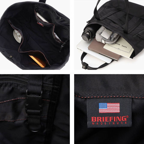 トートにはナイロン製の内袋が付属し、バッグの保管時や持ち運びの際に便利です。ほこりや汚れを防ぐだけでなく、衣類や小物を分けて収納するサブバッグとしても活躍。使う人のライフスタイルを考えた実用的な付属品で、BRIEFINGの細やかな配慮と機能美が感じられます。