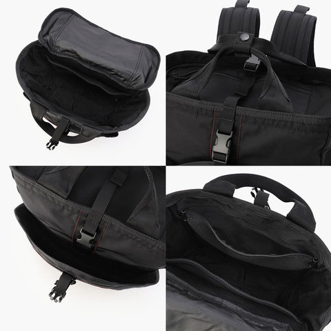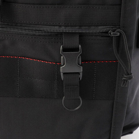 フロントにはストラップで留める構造のポケットを配置。かさばるアイテムやテニスラケットなども固定可能で、ビジネスからアクティブシーンまで幅広く対応します。