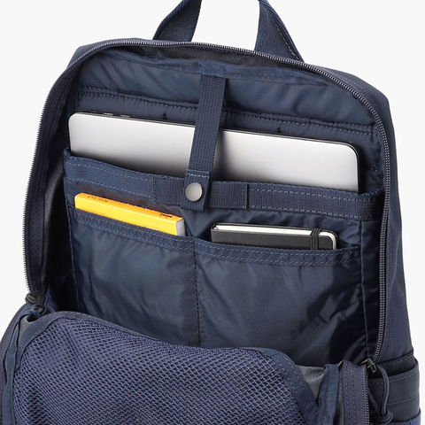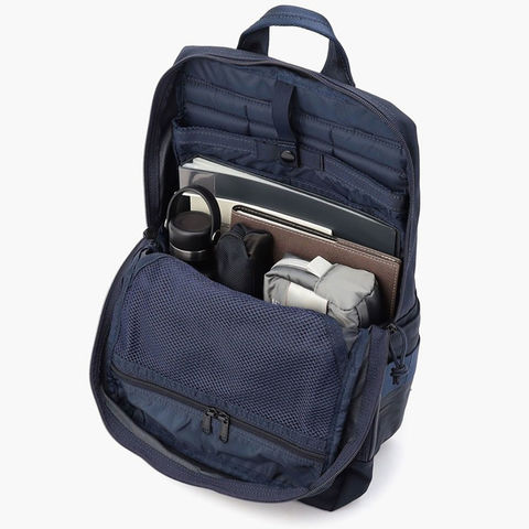 約13Lのコンパクトサイズながら、フロントにマチ付きポケットを2つ配置し、高い収納力を実現。メイン収納内にはPCスリーブやガジェット用ポケットを備え、ビジネスツールを効率的に整理。必要なものをすぐに取り出せるスマートな設計です。
