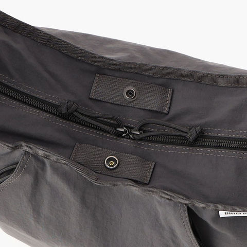 ・特徴的なショルダーストラップや生地の風合いを活かし、フロントは隠しポケットを左右に配置。