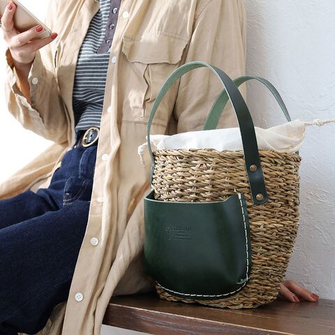 ナチュラルなカゴにレザーを合わせることで上品さをプラス。