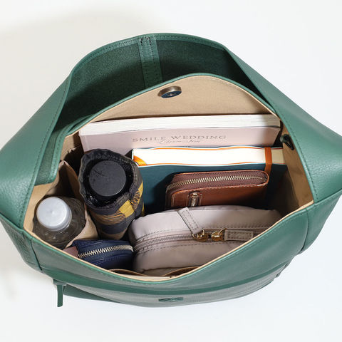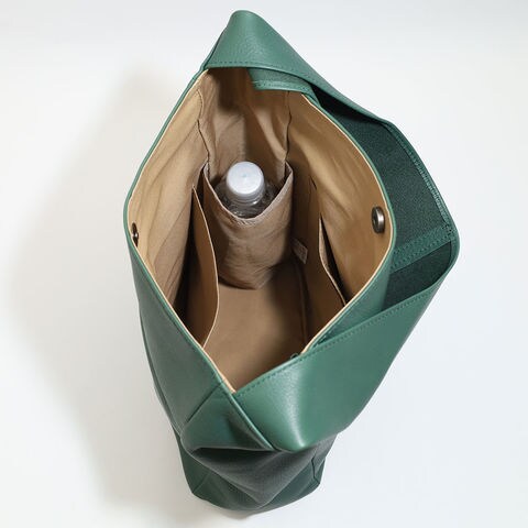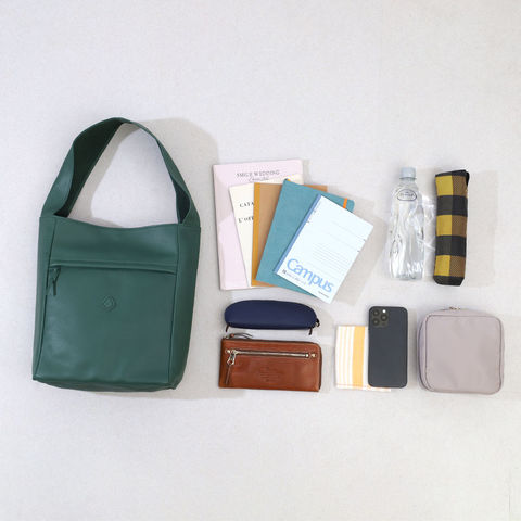 スマートフォンや鍵など、よく使うアイテムは前面ファスナーポケットへ。内側にはオープンポケットと、ペットボトルや日傘が立てて収納できるサイドポケットもあり、整頓上手なバッグです。