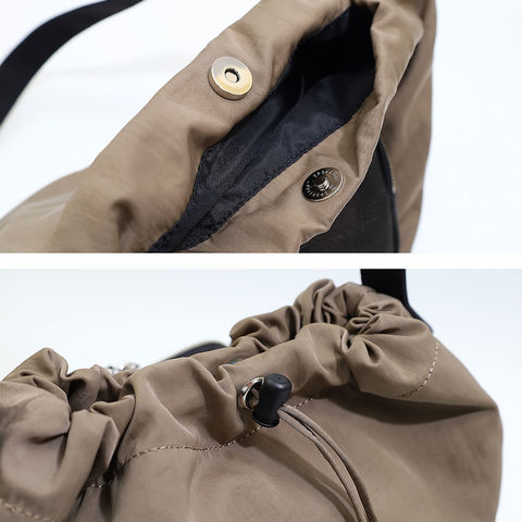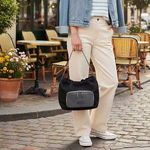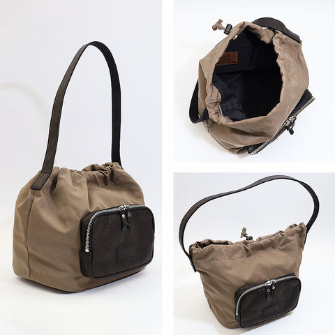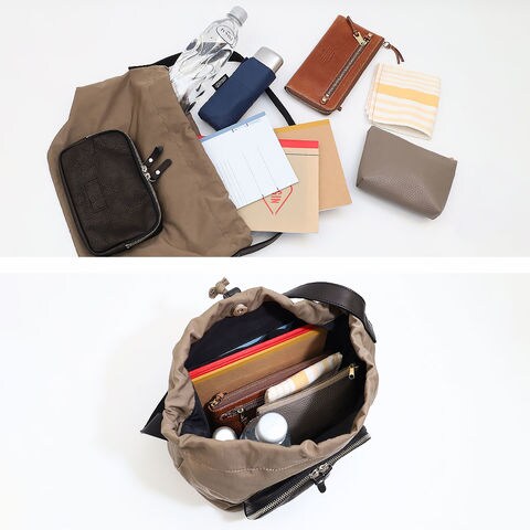 口元はドローストリング仕様で、きゅっと絞れば丸みのあるやさしいシルエットに。広げれば開放感のあるフォルムになり、荷物の出し入れもスムーズです。スタイリングや荷物量に合わせて表情を変えられる、デザイン性と機能性を兼ね備えた仕様です。