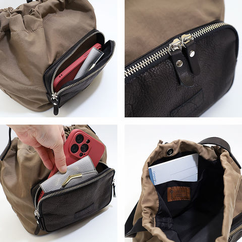 カジュアルなナイロン素材にレザーパーツを組み合わせることで、さりげない上質感をプラス。シンプルながら大人の品格を感じさせるデザインに仕上がっています。日本製ならではの丁寧な作りも魅力で、長く愛用できるデイリーバッグとして活躍します。
