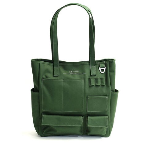 コットン100%の11号帆布の裏に、PVC加工を施し撥水機能をもたらしたF/CE.の撥水キャンバス【W.R CANVAS】を使用した、フロントにスマートフォンやペン入れなど、様々な形のポケットが施された縦型のトートバッグ。