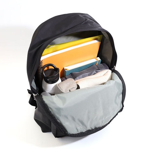メインコンパートメントはファスナーが大きく開き、荷物の取り出しがスムーズ。A4サイズやデイリーアイテムもストレスなく収納できます。