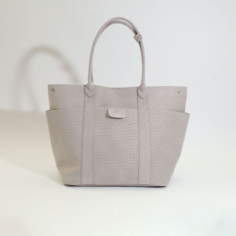 バッグの左右を覆う大胆なポケットデザインが、シンプルながら個性的な印象を演出。両サイドのホックを留めると、丸みのある優しいフォルムに変化し、スタイルに合わせたシルエットを楽しめます。