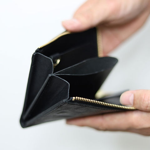 L字ファスナーを開くと、ジャバラ状に大きく広がり、見た目以上の収納力を持つフリースペースが現れます。紙幣はもちろん、カードも重ねて約10枚収納可能です。