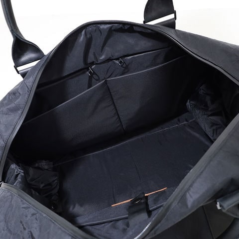 両側の収納スペースはメインと分離されており、靴や濡れ物を分けて収納可能。スポーツや出張時にも便利です。