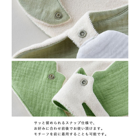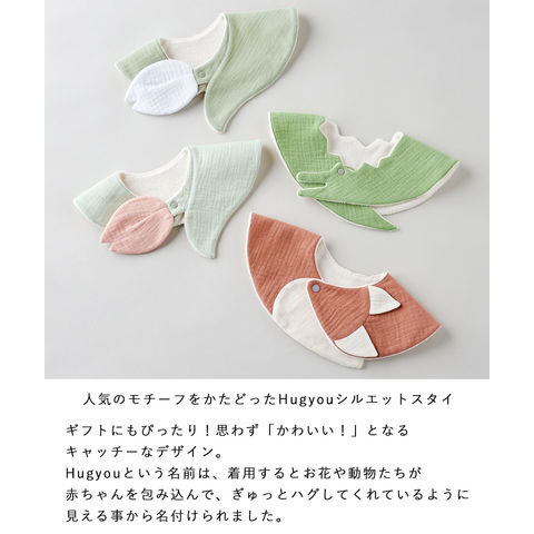 | シリーズ案内 | 人気のモチーフをかたどったHugyouシルエットスタイ ギフトにもぴったり!思わず「かわいい!」となるキャッチーなデザイン。 Hugyouという名前は、着用するとお花や動物たちが赤ちゃんを包み込んで、ぎゅっとハグしてくれているように見える事から名付けられました。 赤ちゃんの肌に優しい綿100%のガーゼ素材、裏面は吸水性抜群のパイル生地を採用しています。 サッと留められるスナップ仕様で、お好みに合わせ前後でお使い頂けます。モチーフを前に着用することも可能です。 |