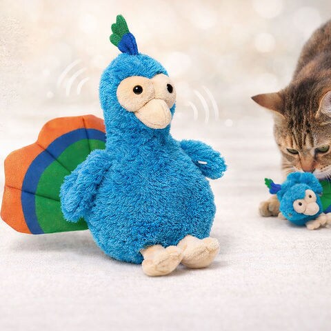 カラフルで個性的なくじゃくモチーフのデザインは、見た目にも楽しくペットの遊び心を刺激します。ぬいぐるみタイプで柔らかく、くわえたり抱えたりして遊びやすい形状。お部屋に置いてもかわいいデザインのおもちゃです。