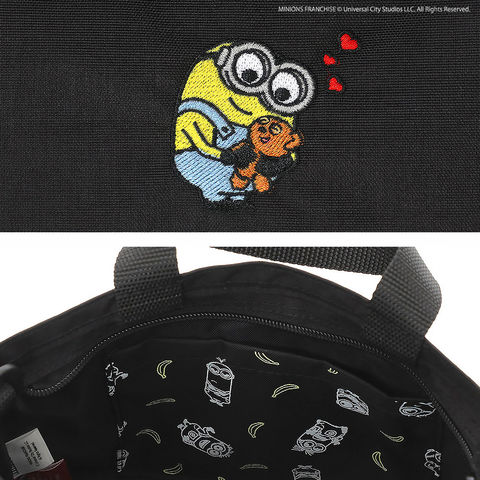 モデルごとに異なるアートワークを採用し、「ミニオン」のコミカルで愛らしい動きや表情を刺繍で表現。背面には『怪盗グルー/ミニオンズ』シリーズのロゴ刺繍を配置し、さらに内側にはミニオンと大好物のバナナのプリントを施した遊び心あふれるデザインです。バッグを開けた瞬間まで楽しい、ミニオンの世界観を細部まで楽しめます。