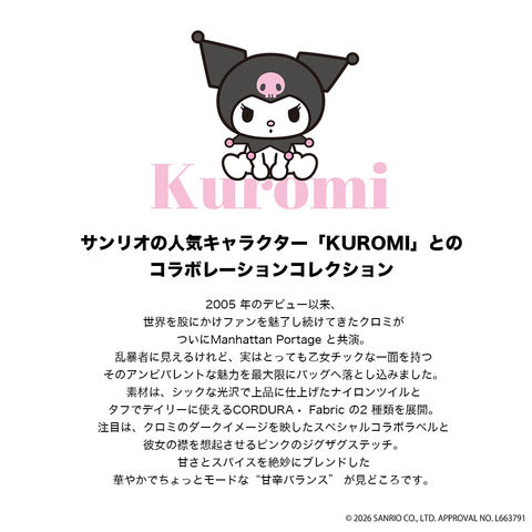 2005年のデビュー以来、世界中のファンを魅了してきたクロミとManhattan Portageが共演した数量限定モデル。ダークでキュートな魅力を落とし込み、コラボならではの特別感を存分に楽しめます。今しか手に入らない希少性も大きな魅力です。