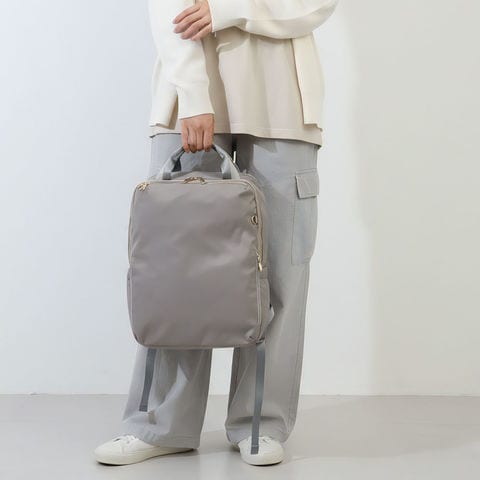 スクエアフォルムのすっきりしたシルエットが通勤スタイルに自然に馴染みます。装飾を抑えたシンプルなデザインは服装を選ばず、オンオフ兼用で使いやすいのが特徴。持つだけで整った印象を与える大人のリュックです。