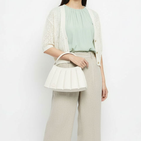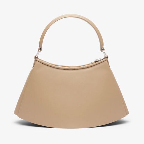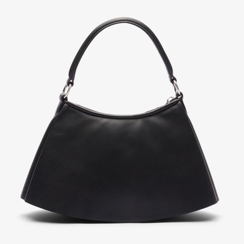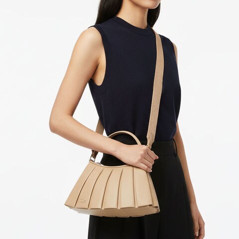 フロントはプリーツで華やかに、背面はシンプルなフラットデザインに仕上げたバランスの良い設計。立体的なシルエットがスタイリングに動きを与えながら、背面はすっきりとした印象を保ちます。どの角度から見ても美しいフォルムが魅力のデザインバッグです。