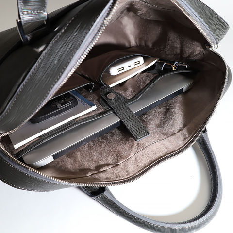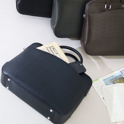 内装にはペンホルダーや仕切りポケットを備え、ノートPCやスマートフォンもすっきり収納可能。底びょう付きで自立しやすく、デスクサイドでも上品に佇みます。