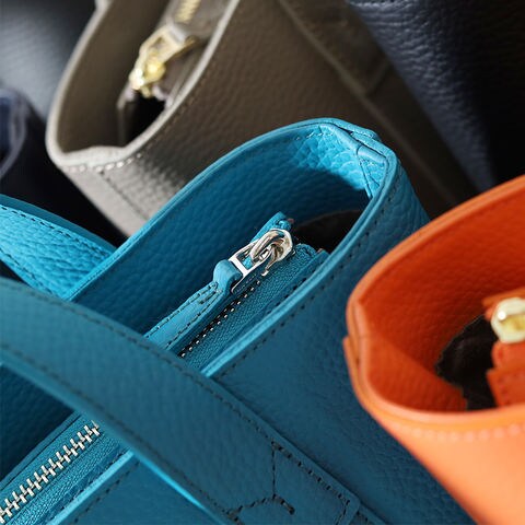 レザーのカラーに合わせて金具色を選定。グレージュやオレンジにはゴールド、ブラックやネイビーにはシルバーを採用し、洗練された統一感のある仕上がりになっています。