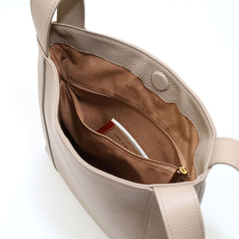 スリムな印象ながら、長財布やペットボトルまで収まる実用的な収納設計。内側にはファスナーポケットと仕分けポケットを備え、荷物を整理しやすくなっています。必要な物を無理なく持ち運べます。