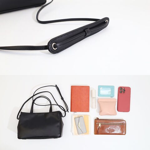 長さ調整可能なショルダーストラップは取り外し可能。肩掛け、斜め掛け、ハンドバッグとして自由に使えます。