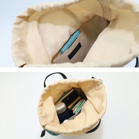 開閉は中身が見えにくく安心な巾着タイプ。荷物の出し入れもしやすく、防犯面でも安心して使えます。さらに内側にはオープンポケット付きで、小物の整理もスムーズ。見た目だけでなく使いやすさにもこだわっています。