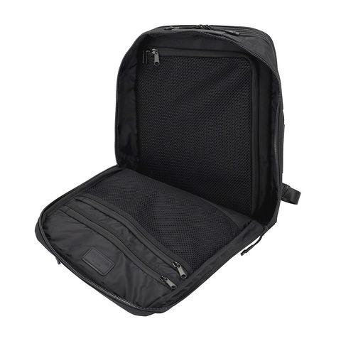 メイン荷室は大きく開く設計で、中身の確認や出し入れがスムーズ。内部のメッシュ仕切りは衣類収納にも便利で、出張時のパッキングがしやすく、移動中も荷物が乱れにくい構造です。