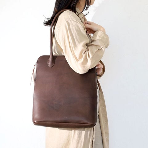 両サイドがファスナーで開閉できる縦型トートバッグです。アウターの上からでももたつく心配のない、長めのハンドルデザイン。