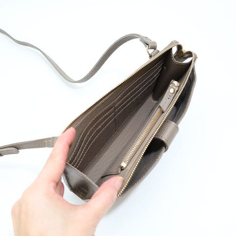 ファスナー付きのメイン収納には、二つ折り財布やエコバッグなどの必需品がコンパクトに収まります。身軽に出かけたい日のお供として、頼れるスマートフォンポシェットです。