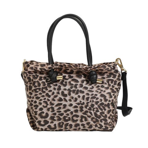 弱撥水素材でお手入れラクラク。モダンなフォルムに大胆なレオパード柄を効かせたデザインは、オンにもオフにも映える仕上がり。肩がけしやすい持ち手の長さも使いやすさのポイントです。