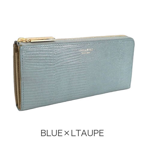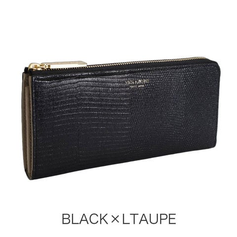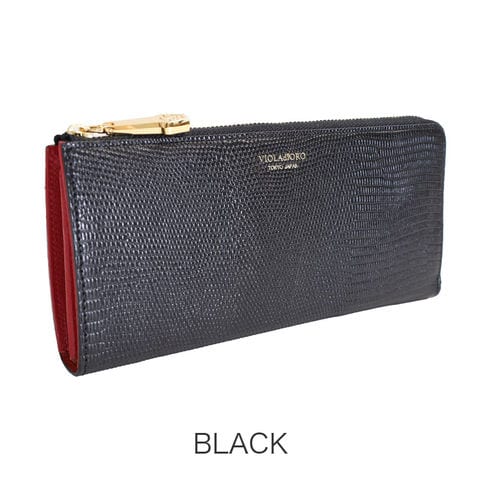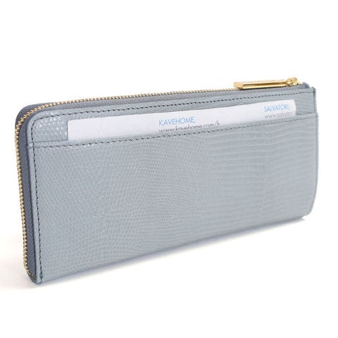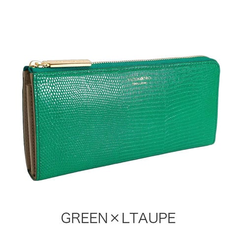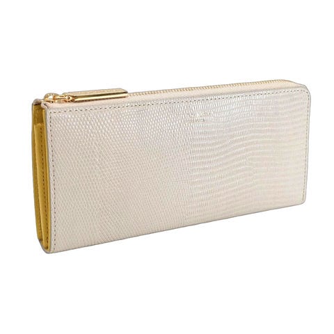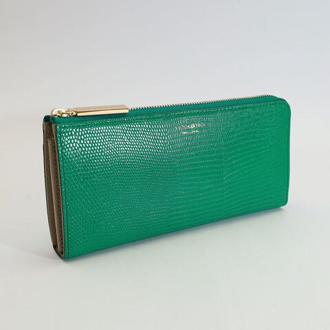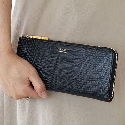 女性の手元を彩るリザード型押しL字財布
