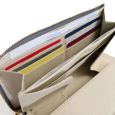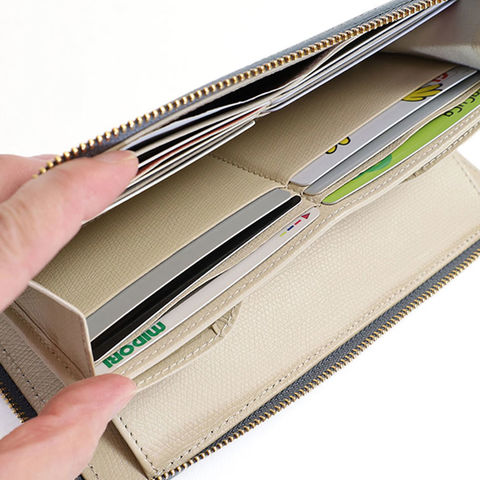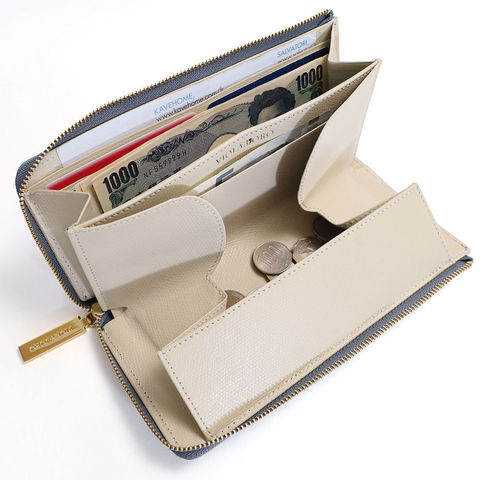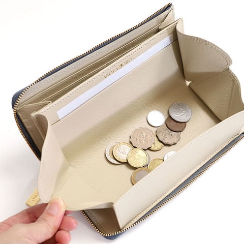 L字ファスナーで大きく開き、中身が一目でわかる便利さ。小銭入れもしっかり開くので、出し入れがスムーズで安心です。