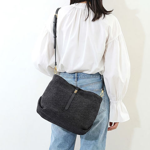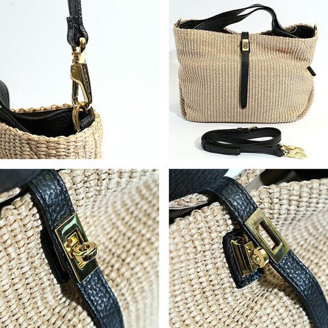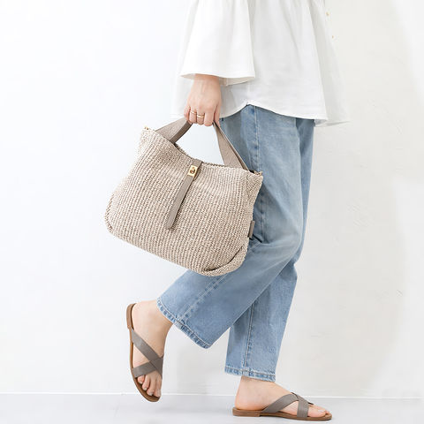 ラフィアのようなナチュラルな風合いを表現したラフィア調シートを使用。天然素材ではなく生地素材にすることで、従来の手編みかごバッグでは難しいクリーンで洗練されたデザインに仕上げています。軽く扱いやすく、洋服との摩擦を気にせず持てるため、デイリーに使いやすいバッグです。