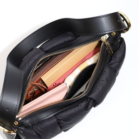 長財布やポーチ、スマホなど必需品をきちんと収納可能。小物の整理もしやすい設計です。